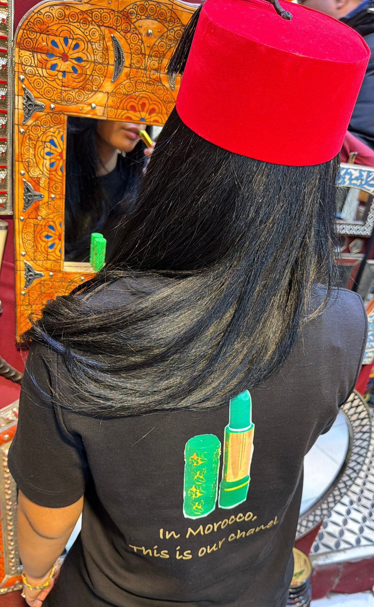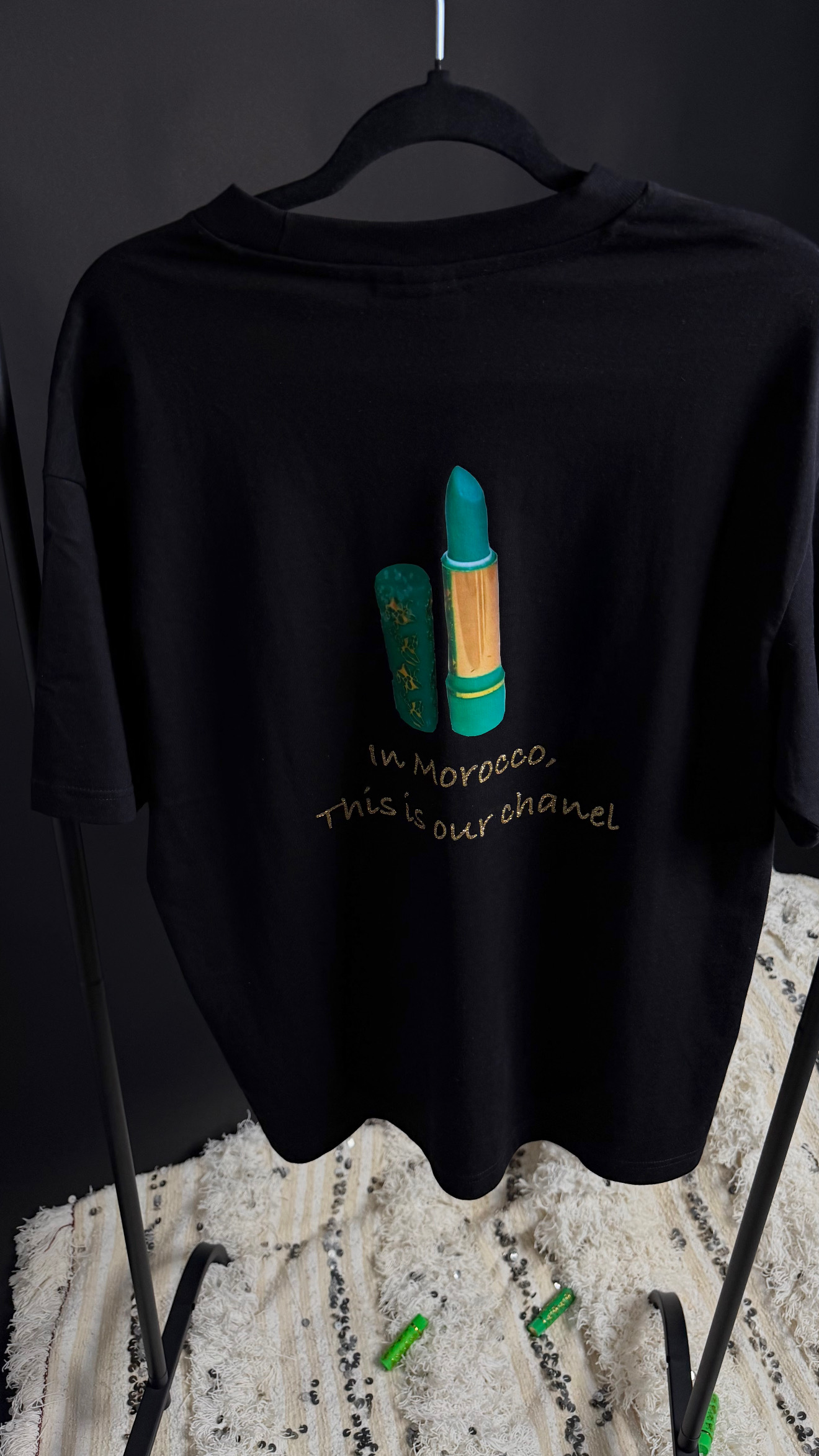 T-shirt unique mettant à l’honneur le célèbre 3kar fassi, aussi connu comme le rouge à lèvres magique, véritable symbole du patrimoine marocain. Avec son design élégant et évocateur, ce modèle célèbre la beauté traditionnelle et l’authenticité. Confectionné dans un tissu doux et confortable, il allie style moderne et héritage culturel pour un look à la fois original et chargé d’histoire.